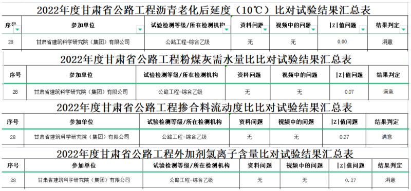 2022年12月12日,甘肅省交通建設(shè)質(zhì)量安全造價(jià)中心公布了《關(guān)于甘肅省2022年公路工程試驗(yàn)檢測(cè)機(jī)構(gòu)及工地試驗(yàn)室比對(duì)試驗(yàn)結(jié)果的通報(bào)》,甘肅建科院市政公路專業(yè)事業(yè)部參加的各項(xiàng)比對(duì)試驗(yàn)均獲得“滿意”結(jié)果。