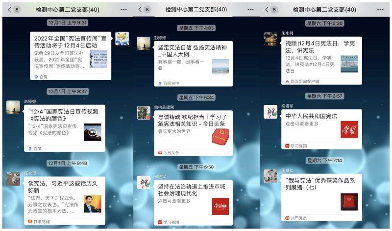 近日,檢測中心第二黨支部組織全體黨員干部職工圍繞“學習宣傳貫徹黨的二十大精神,推動全面貫徹實施憲法”主題,利用微信學習群開展“日日我分享”活動,通過分享學習資料、撰寫學習心得體會、開展二十大精神學習、憲法知識測試以及參加“中國普法欄目”開展的“憲法宣傳周”有獎競答活動等方式,進一步加深了對憲法知識的學習。