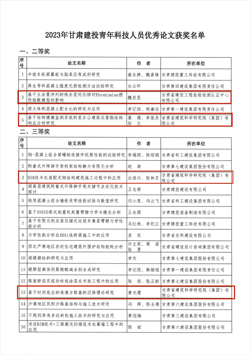 2023年甘肅建投青年科技人員優秀論文評審公示已結束。甘肅建科院共4篇論文獲獎,其中二等獎2篇,三等獎2篇。
