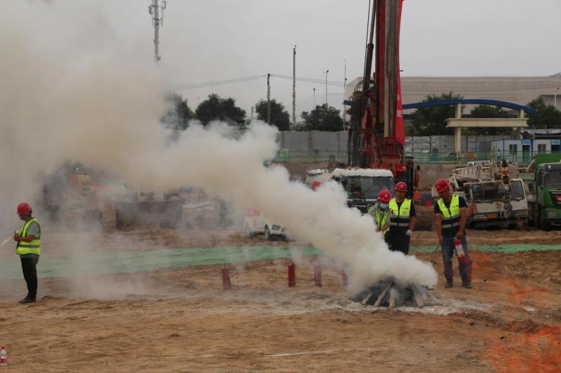 隨后,進行了火災演練:存放材料倉庫突然濃煙滾滾,火苗四竄,現場情況十分危急。工人從現場逃生,現場安全員第一時間向消防報警,并向項目負責人和建設單位領導報告,應急指揮部立即啟動應急預案,做出滅火救援部署。技術和救援小組第一時間到達現場進行救援,使用干粉滅火器及消防用水滅火,安全警戒組立即對著火點設置警戒線,防止其他工人進入危險地帶。