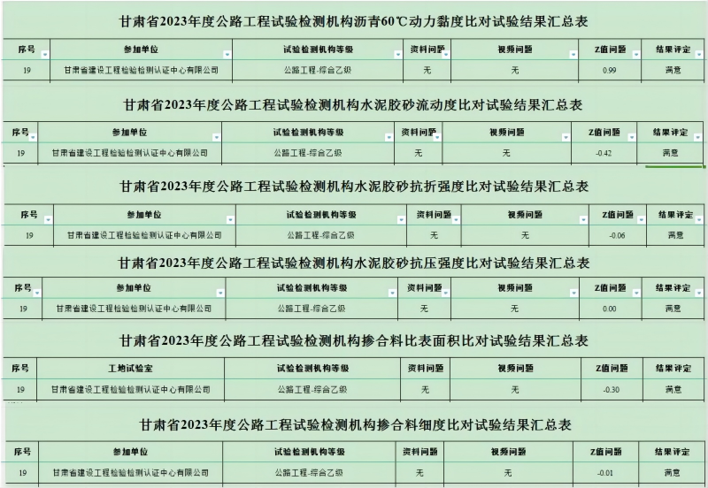 比對試驗是通過多個試驗室間比對來確定試驗室檢測能力的活動,也是考察試驗室運行是否滿足質量管理要求的主要手段。甘肅省建設工程檢驗檢測認證中心有限公司作為甘肅省公路工程綜合乙級檢測單位參加本次比對試驗,單位各級領導高度重視,市政公路專業事業部積極組織檢測人員參與本次公路行業比對試驗,安排檢測人員對照檢測儀器設備、檢測環境、數據分析嚴格按照操作規程及作業指導書要求進行檢測,并根據本次比對試驗的視頻要求對整個試驗過程進行了全程錄像。甘肅省建設工程檢驗檢測認證中心有限公司試驗結果Z比分數均小于2.0,六項檢測參數均取得滿意結果。通過本次比對試驗證明,甘肅省建設工程檢驗檢測認證中心有限公司在人員、設備、環境、試驗方法掌握等各方面均持續保持較高的檢測技術能力,符合上級主管部門對試驗檢測機構持續保持檢測能力的要求。