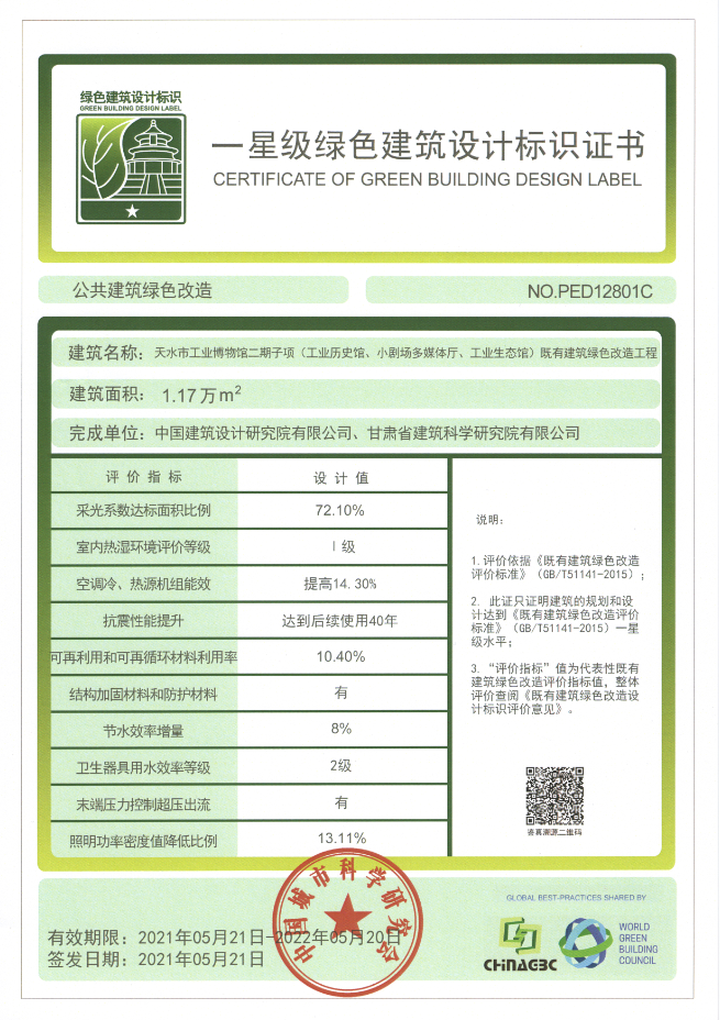 10月,中國城市科學研究會通過線上的方式召開全國第七批綠色建筑標識評審會,由建科院(集團)公司綠建中心進行既有建筑綠色改造設計(一星)評價咨詢的天水市工業博物館二期子項順利通過了綠建評審。2020年8月,中國建筑設計研究院有限公司委托建科院(集團)公司對該項目進行既有建筑綠色改造設計(一星)評價咨詢。建科院(集團)公司綠色建筑與產業研發中心為該項目的綠建改造和綠色建筑標識申報提供了技術支撐。本項目是建科院(集團)公司綠建中心繼《蘭州市建研大廈綠色智慧改造項目》之后的又一個甘肅省既有建筑綠色改造項目評星工作,此項工作的順利完成在響應國家政策號召的同時也體現了建科院(集團)公司在既有建筑物綠色改造方面的雄厚實力。