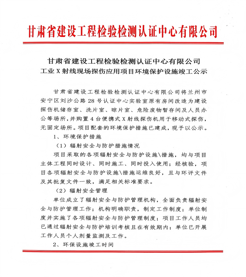 工業X射線現場探傷應用項目環境保護設施竣工公示