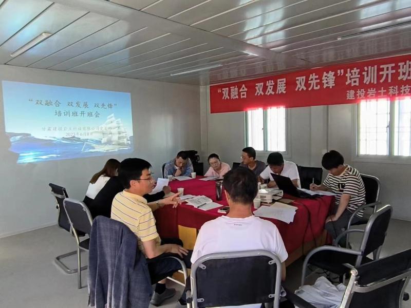 6月8日,建投巖土科技公司黨支部開展 “雙融合 雙發展 雙先鋒”第一期“送教上項目”培訓活動開班儀式。此次活動在和政沈家莊項目部展開,建投巖土公司領導班子、相關部門負責人及項目全體人員參加。