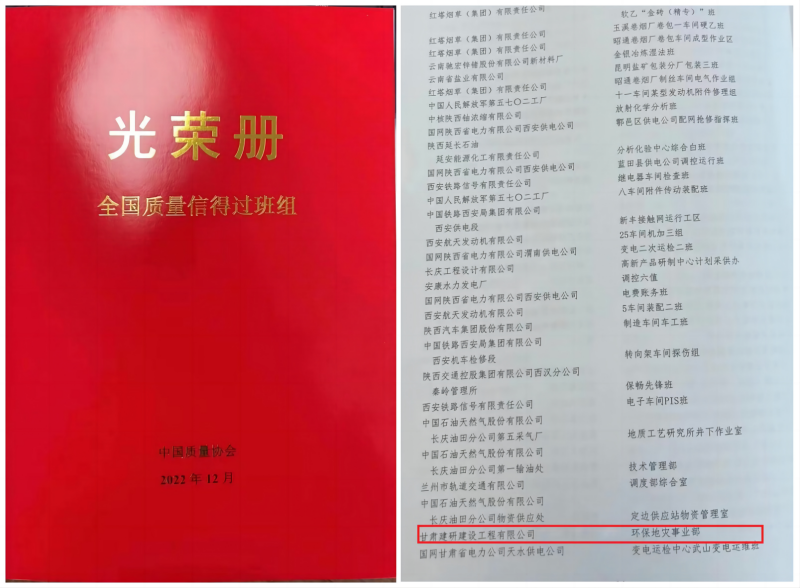 近日,在中國質(zhì)量協(xié)會2022年“全國質(zhì)量信得過班組”建設(shè)推進活動中,甘肅建研建設(shè)工程有限公司環(huán)保地災(zāi)事業(yè)部經(jīng)過層層選拔,繼獲得“甘肅省質(zhì)量信得過班組”榮譽后,又榮獲“2022年全國質(zhì)量信得過班組”。