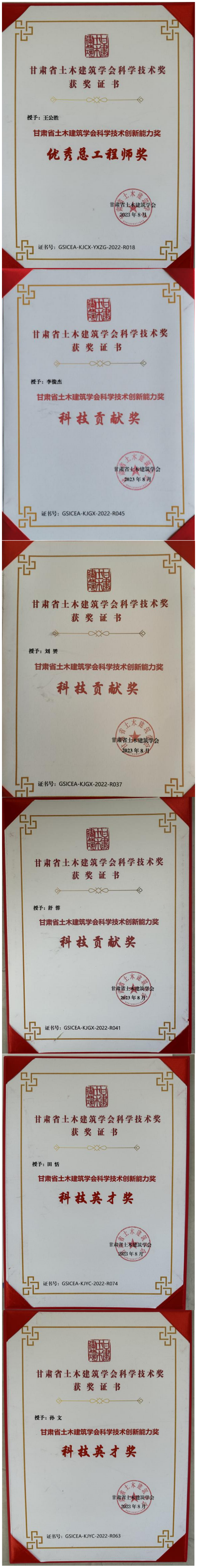10月20日,在甘肅省土木建筑學會組織舉行的“甘肅省建設行業科技創新成果研討會暨頒獎典禮”上,甘肅建科院獲2022年度甘肅省土木建筑學會“科學技術獎”一等獎2項,二等獎1項;獲甘肅省土木建筑學會科學技術創新能力獎“科技創新獎”1項。王公勝獲甘肅省土木建筑學會科學技術創新能力獎“優秀總工程師獎”;劉赟、李俊杰、舒蓉3人獲甘肅省土木建筑學會科學技術創新能力獎“科技貢獻獎”;孫文、田恬2人獲甘肅省土木建筑學會科學技術創新能力獎“科技英才獎”。